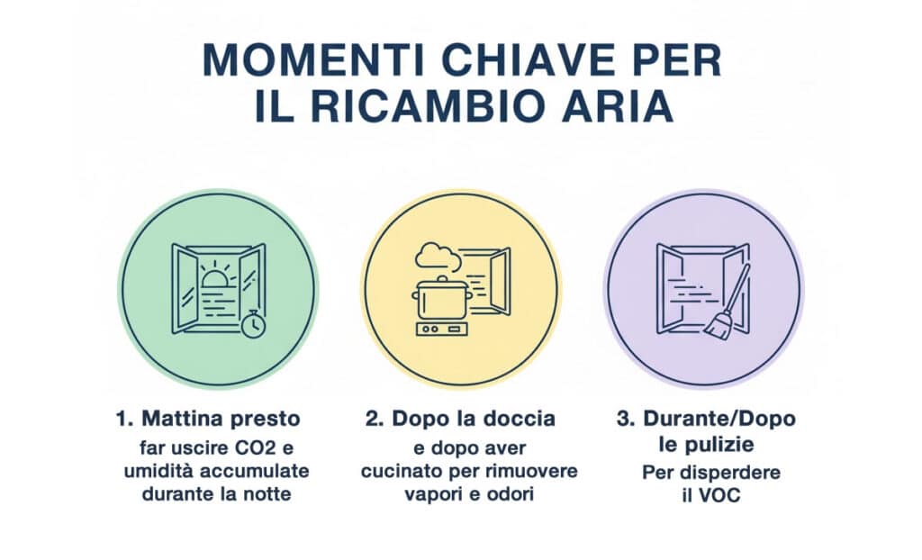 Per massimizzare i benefici del ricambio d’aria, è utile sincronizzare la ventilazione con le attività che generano più inquinanti o umidità. Ecco i momenti chiave in cui agire: